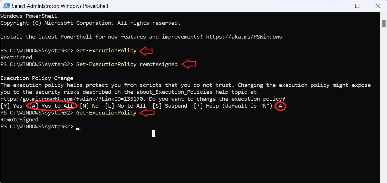 Get-ExecutionPolicy - To set the execution policy do the following command, and confirm your selection by pressing [A]: